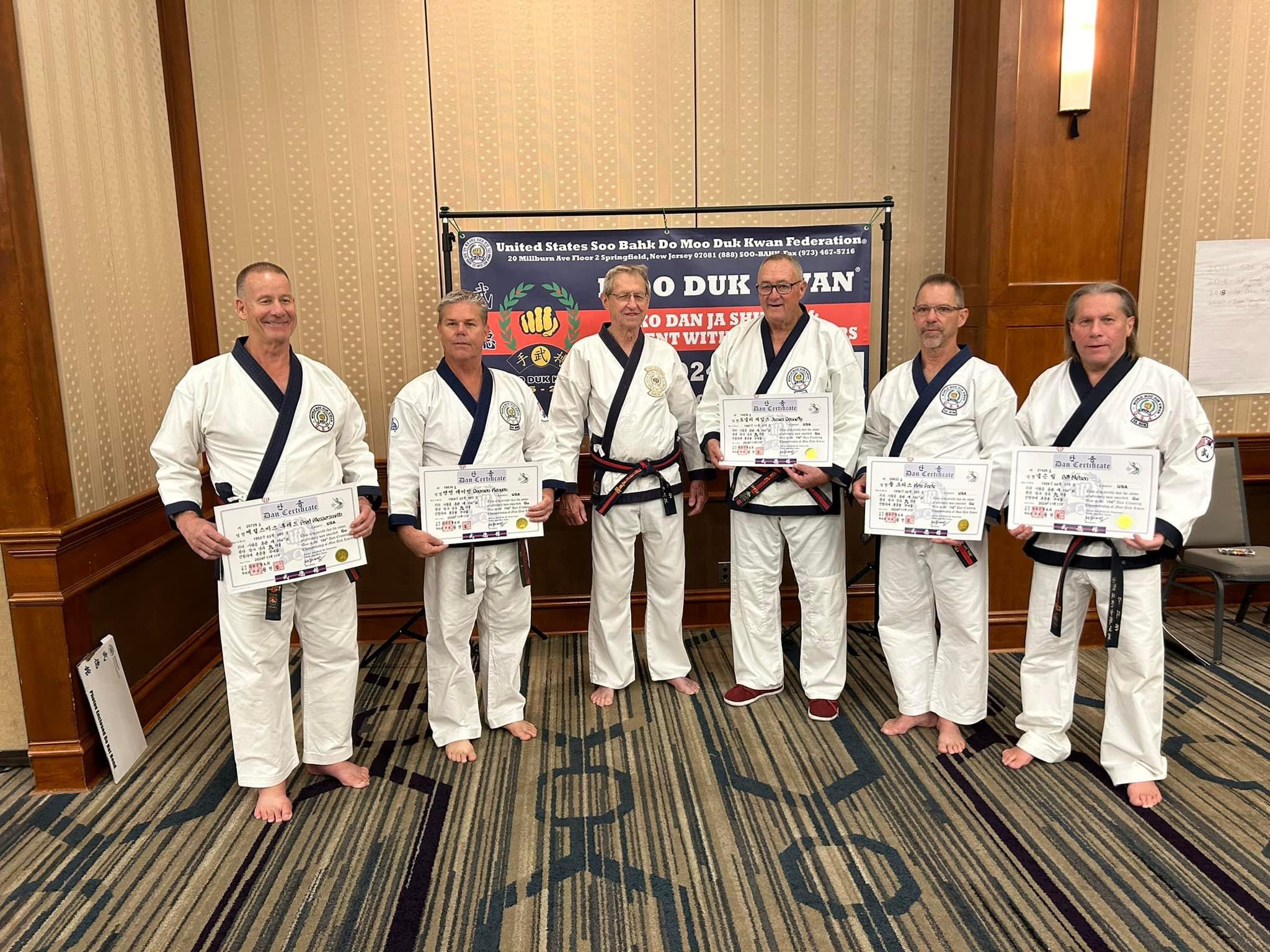 Larry Seiberlich Sa Bom Nim (Senior Advisory Committee) presented Gu Dan Recipients with their rank certificates on behalf of Kwan Jang Nim H.C. Hwang. Left To Right - Fred Messermith, Sa Bom Nim (CA), Daymon Kenyon Sa Bom Nim (CA), Larry Seiberlich, Sa Bom Nim (MN), Jim Donnelly, Sa Bom Nim (VA), Kris Poole Sa Bom Nim (TX), Bill Nelson, Sa Bom Nim (MN).