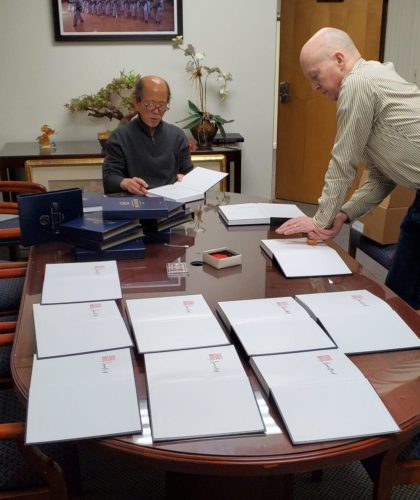 Today, February 26, 2020 , Kwan Jang Nim H.C. Hwang began autographing the shipment of Collector's Limited Edition Volume One textbooks. Sometimes the scale of activity at National Member Headquarters may not be evident to members. Perhaps the previous photos of the pallets of books and these photos can help convey the scope of the task before Kwan Jang Nim. Assisting him is Sa Bom Nim Erik Orella who also helped move the two pallets of books up two flights of stairs to Headquarters.