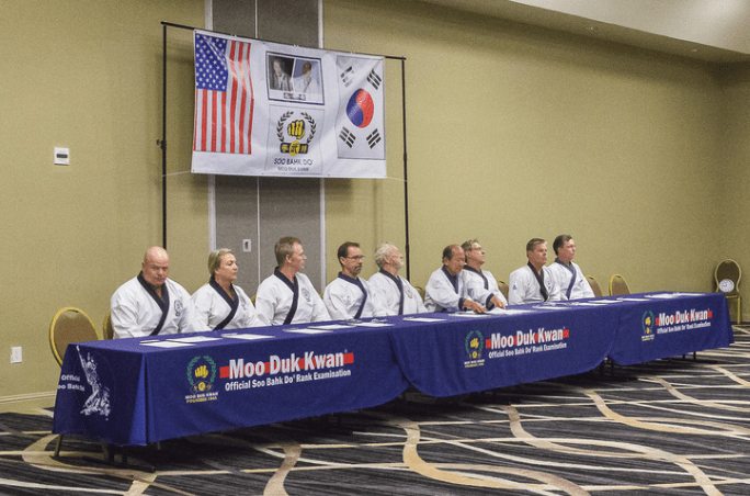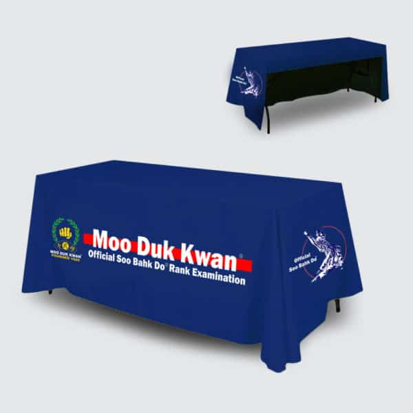 Official MOO DUK KWAN® table cover for rank examinations by MOO DUK KWAN® Certified Instructors. Hi-quality fabric sewn to a perfect custom fit for a six ft table. Open back for comfortable seating for examiners.