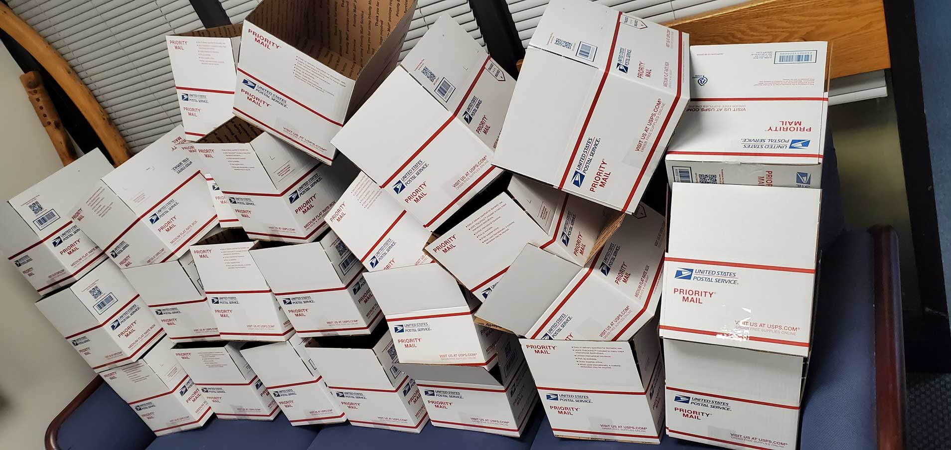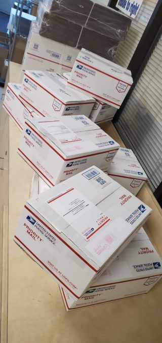 Next, the Priority Mail packages are stacked near the front entrance on the ground floor for U.S. Postal Service pickup.